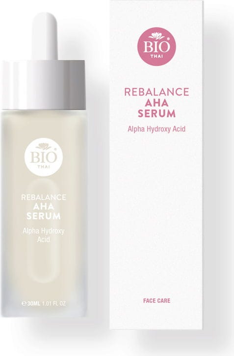 Das Rebalance Serum AHA von Bio Thai ist ein konzentriertes Hautpflegemittel, das Hautunreinheiten im Gesicht reduziert. Dank der natürlichen Alpha-Hydroxysäure, die im Serum enthalten ist, verfeinert sich das Hautbild und Du bekommst einen wunderbar samtigen, strahlenden Teint.
