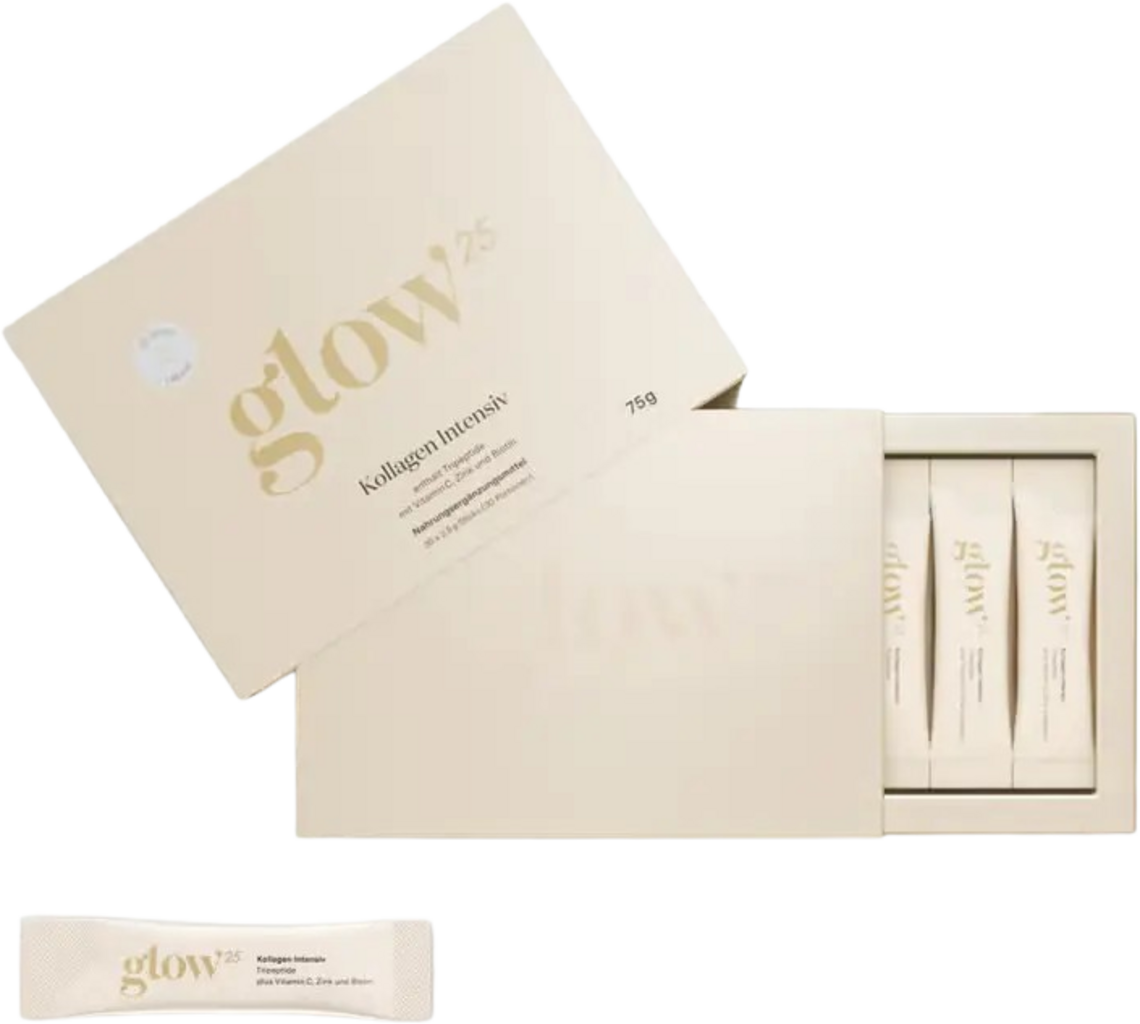 Die Formulierung des Kollagen Intensiv Pulvers von Glow25 überzeugt mit innovativer Tripeptid-Formel, bei der die kleinen Kollagen-Tripeptide (ca. 500 Dalton) dank enzymatischer Spaltung bereits optimal aufgeschlossen sind. Dadurch kann dein Körper das Kollagen besonders schnell aufnehmen. Das Pulver ist geschmacksneutral und zusätzlich mit Vitamin C, Zink und Biotin (auch bekannt als Vitamin H) angereichert.