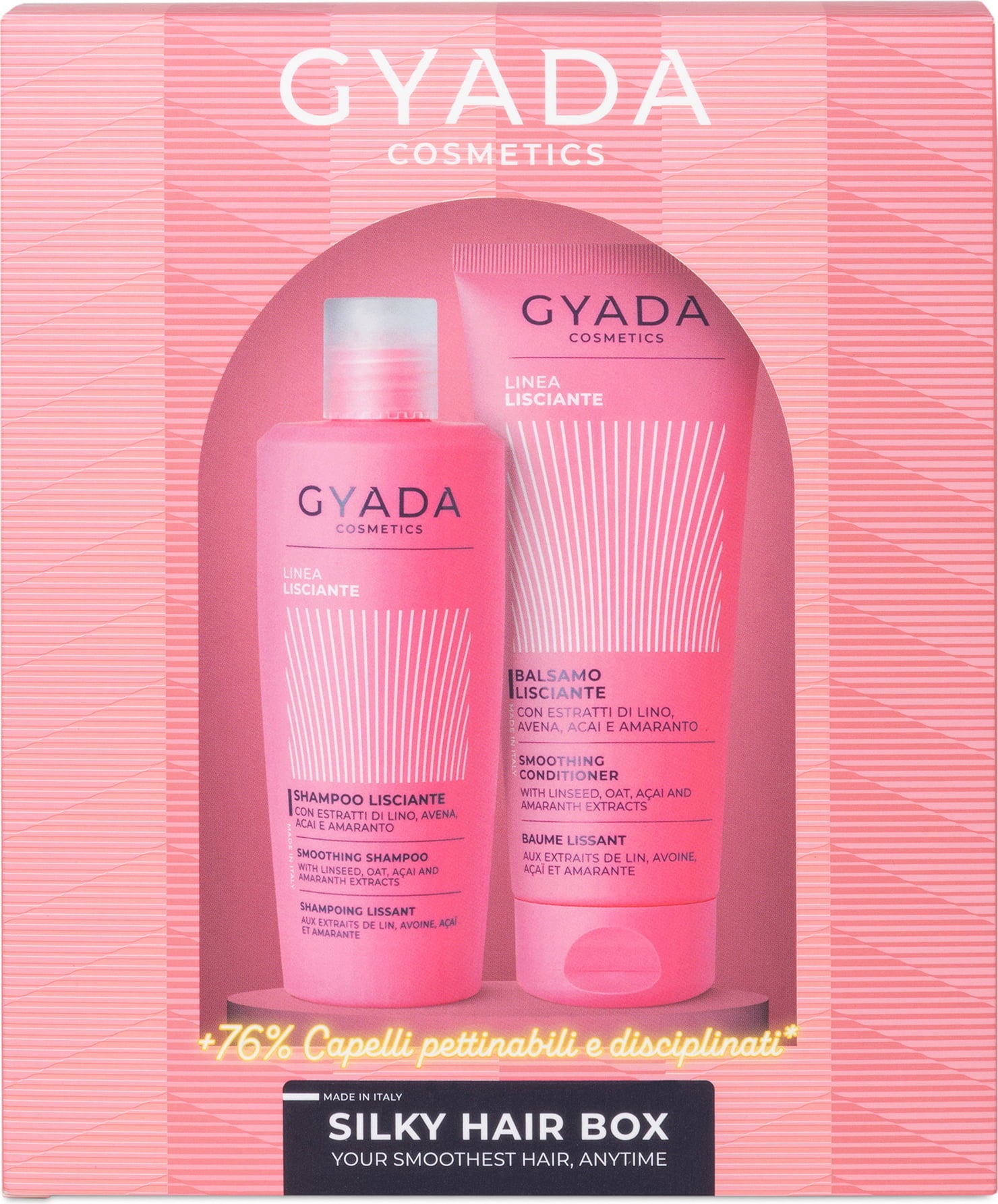 Die Silky Hair Box enthält zwei Haarpflege-Produkte, die speziell für glattes Haar formuliert wurden. Das Duo aus Shampoo und Spülung ist angereichert mit Extrakten aus Flachs, Hafer, Acai sowie Amaranth, reinigt sanft die Kopfhaut und entwirrt das Haar. Es sorgt so für angenehme Kämmbarkeit und Glanz.