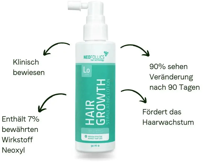 Die Neofollics Hair Growth Lotion von Neofollics enthält 7% Neoxyl®, ein Haarwuchskomplex mit aktiven Inhaltsstoffen, die in Synergie arbeiten und gezielt gegen Haarausfall vorgehen. Zu diesen Inhaltsstoffen gehören Haarwuchsmoleküle wie Adenοsine, Vividine® und Aminexil® sowie Pflanzenextrakte wie Ecklonia Cava und Himbeerketon. Diese Kombination versorgt Haare sowie Kopfhaut mit reichlich Nährstoffen und aktiviert den Wachstum.