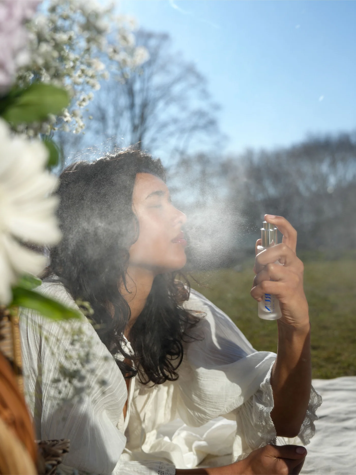- Schritt 2: Sprühe 4–6 Pumpstöße gleichmäßig auf Gesicht, Hals und Dekolleté. Bei Bedarf leicht mit den Händen verblenden und diese nachher waschen.