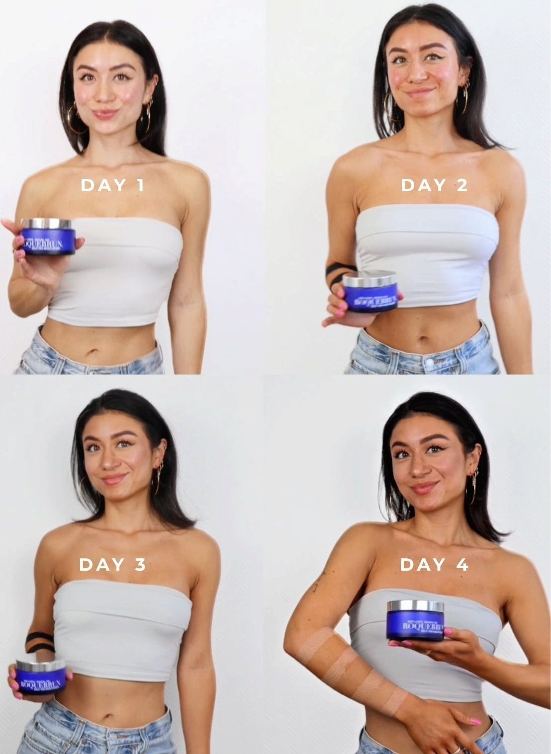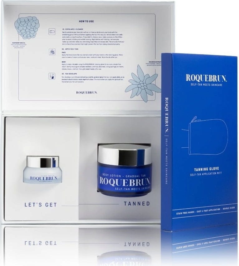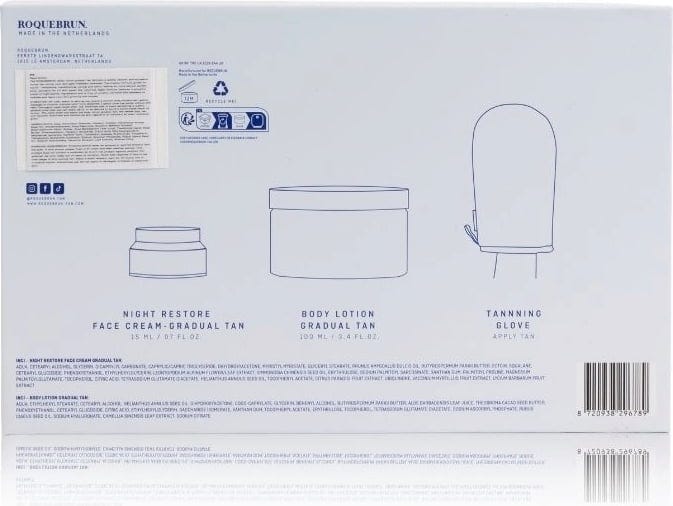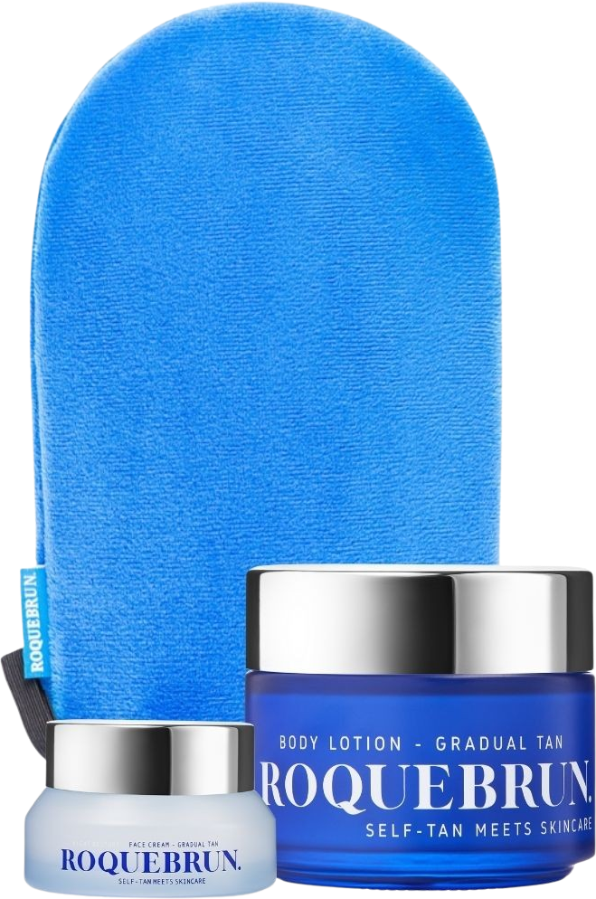 Das Tan Out Of Ten Set von ROQUEBRUN schenkt dir eine nahtlose, sonnengeküsste Ausstrahlung von Kopf bis Fuß, ganz ohne Streifen oder Stress. Mit der Kombination aus der regenerierenden Night Restore Face Cream und der beliebten Körperlotion baust du dir Schritt für Schritt eine natürliche Bräune auf, während deine Haut intensiv mit Feuchtigkeit versorgt wird. Der beiliegende, samtweiche Bräunungshandschuh garantiert dir ein kinderleichtes und gleichmäßiges Auftragen, während der elegante Perlmutt-Löffel eine hygienische Entnahme deiner Gesichtspflege ermöglicht. Die pflegenden Formeln ziehen schnell ein und verhalten sich dank hochwertigen Inhaltsstoffen besonders besänftigend auf deiner Haut. Freu dich auf ein seidig-glattes Finish und einen Teint, der wie frisch aus dem Urlaub aussieht – jeden Tag aufs Neue.