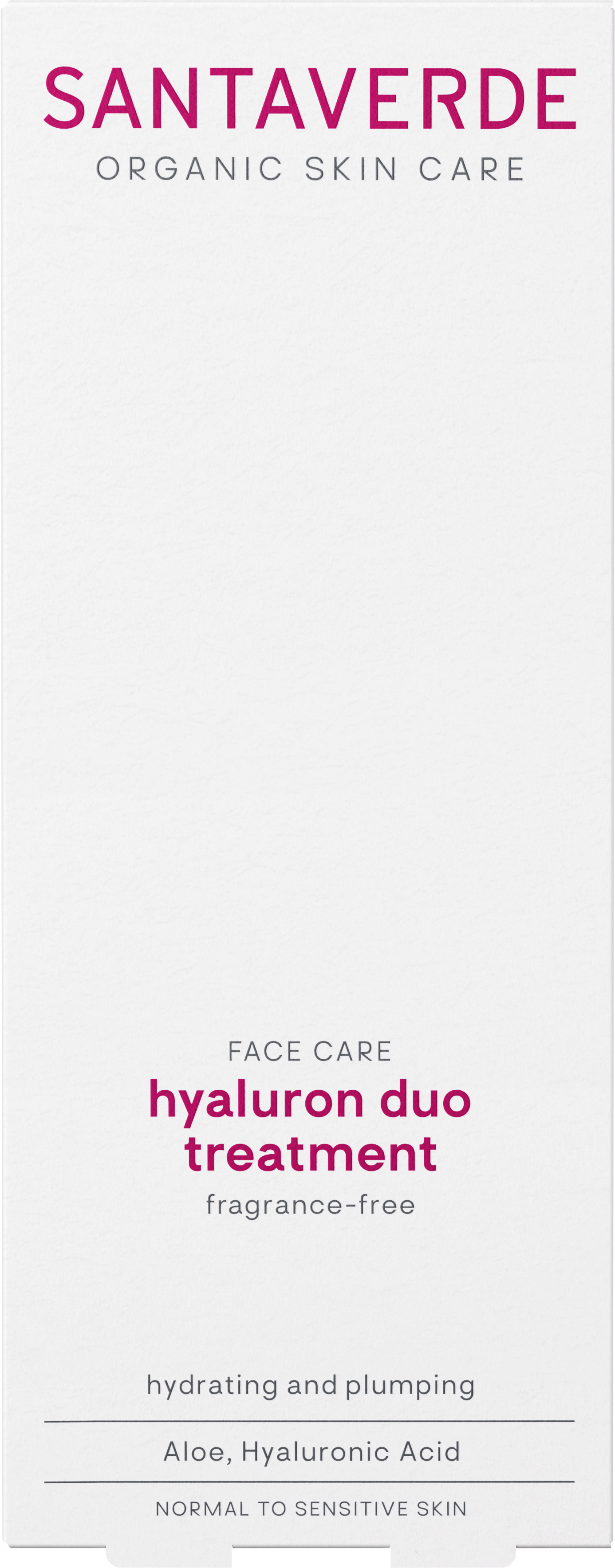 Das FACE CARE hyaluron duo treatment von Santaverde bietet eine effektive Hydratation dank zweierlei Hyaluronsäuren. Hochmolekulares Hyaluron versorgt die obere Hautschicht mit Feuchtigkeit, während niedermolekulares Hyaluron in die tiefen Hautschichten eindringt und damit aufpolsternde Eigenschaften bietet. Bio-Aloe Vera-Saft versorgt die Haut zusätzlich mit Nährstoffen sowie Feuchtigkeit, während Rosenblüten-Hydrolat und Auszüge aus Lavendel sanft pflegen. Dank der ölfreien Textur ist das Serum erfrischend sowie glättend und ist besonders gut für trockene sowie sensible Haut geeignet.
