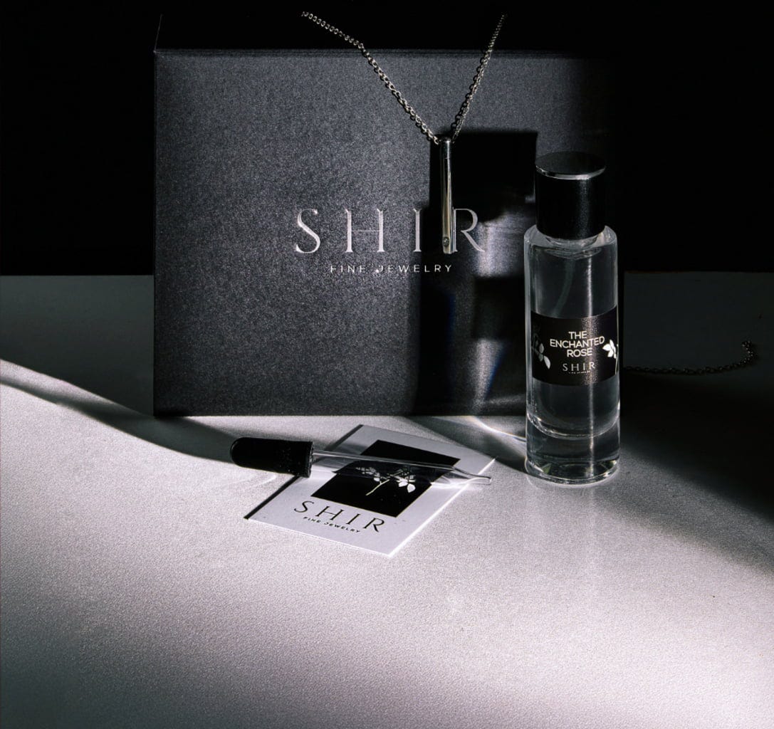 The Enchanted Rose Jewelry Box von SHIR enthält eine Halskette aus Edelstahl mit einem im Labor hergestellten Diamanten. Die Kette ist mit einem nachfüllbaren Anhänger versehen, den du mit dem Enchanted Rose Parfum auffüllen kannst. Die 30-ml-Parfümflasche besitzt einen Sprühkopf und einen Schraubverschluss zum Umfüllen der Flüssigkeit. Verpackt sind die Kette und das Flakon in einer hübschen schwarzen Schmuckschatulle.